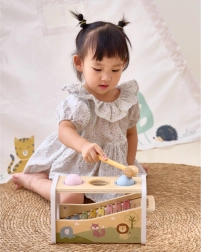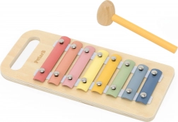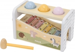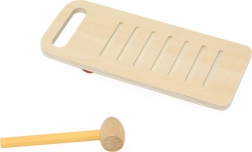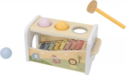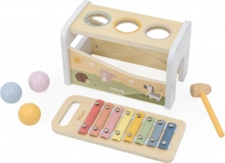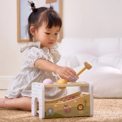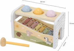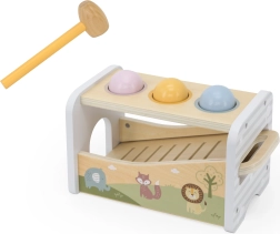Tato všestranná dřevěná hračka spojuje vyťukávací lavici a xylofon do jednoho chytrého celku. Dítě může kladívkem prostukávat barevné kuličky, které se skutálí na kovové klávesy a rozehrají příjemné tóny, nebo vzít paličku a tvořit vlastní melodie.