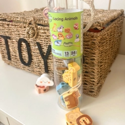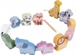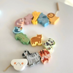 Navlékání dřevěných zvířátek na provázek přirozeně trénuje úchop, koordinaci ruka–oko a přesnost pohybů – ideální příprava na kreslení a psaní.