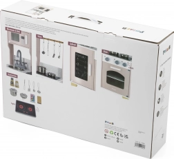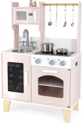 Součástí je bohaté příslušenství: hrnec s poklicí, pánev, lžíce, děrovaná obracečka, stěrka, sada „zeleniny“ a solnička s pepřenkou. Funkční detaily jako 3 otočné knoflíky, otevírací dvířka trouby a skříňky či věšáčky na náčiní dodávají hře realističnost a rozvíjejí jemnou motoriku, kreativitu a sociální dovednosti.