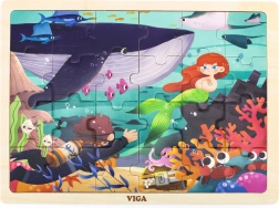 Dětské puzzle VIGA – Tajemství moře přináší barevnou podmořskou ilustraci se syrenkou, potápěčem, rybkami, korálovým útesem i potopenou lodí. Díky dřevěnému rámečku zůstávají dílky při skládání na místě a obrázek podkladové desky slouží jako jasná předloha.