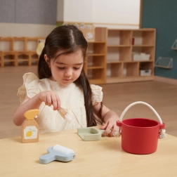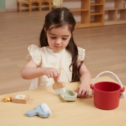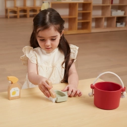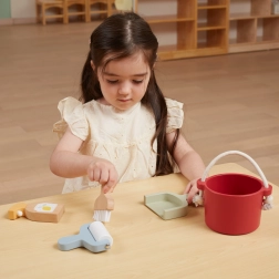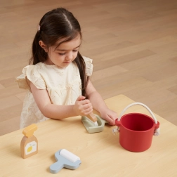 V balení najdete vědro, smetáček se špachtlí, dřevěný rozprašovač a váleček – vše, co dítě potřebuje k „velkému úklidu“. Podporuje fantazii a role-play.