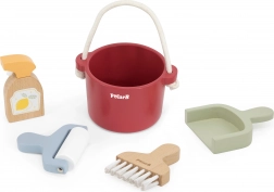 - Kompletní výbava pro hraní na úklid: smeták/smetáček se špachtlí, dřevěný rozprašovač, váleček na nečistoty a červené vědro.