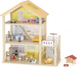 Tento pečlivě navržený domeček nabízí kuchyň s obývákem, koupelnu, ložnici, dětský pokoj, balkon s lehátkem a slunečníkem a také garáž s autíčkem. Součástí je pestrá sada nábytku, 4 figurky a pejsek – vše připraveno k okamžitému hraní.