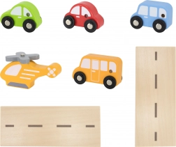 - 4 dřevěná autíčka, dřevěný vrtulník