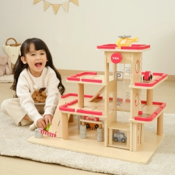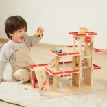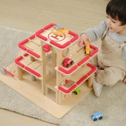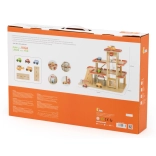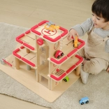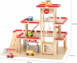Součástí balení jsou 4 dřevěná autíčka, vrtulník a prvky vjezdu a sjezdu. Jasné značení parkovacích míst, myčka a zábrany podporují realistické scénáře a učí děti koordinačním dovednostem.