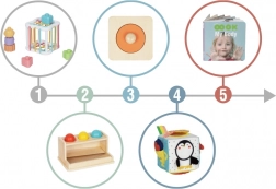Hračky jsou barevné, bezpečné a skvěle se drží v malých ručkách. Díky promyšleným aktivitám si děti procvičují jemnou i hrubou motoriku, koordinaci, vnímání barev a prostorovou představivost. Knížka s reálnými fotografiemi podporuje jazykový rozvoj a povědomí o vlastním těle.
