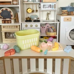 Tato kvalitní dřevěná sada napodobuje skutečné vaření a je ideální pro malé kuchaře od 3 let. Díly jsou barevné, příjemné do ruky a díky suchému zipu nebo magnetům se dají „krájet“ a znovu spojovat. Děti si při hře procvičí koordinaci oko–ruka, naučí se rozpoznávat potraviny a rozvíjejí komunikační a sociální dovednosti při hře v týmu.