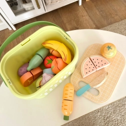 Dřevěné ovoce a zelenina se dají „rozkrájet“ a opět spojit – děti si vyzkouší přípravu jídel bezpečně a zábavně.