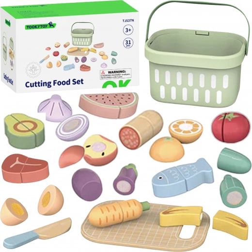 Objevte dřevěnou sadu potravin na krájení od Tooky Toy, která podporuje kreativní hru, rozvoj jemné motoriky a učení o zdravém stravování. Sada s 31 díly v praktickém plastovém boxu zahrnuje ovoce, zeleninu, rybu, vajíčko, prkénko a nožík pro bezpečné „krájení“ a vaření.