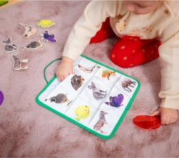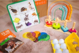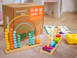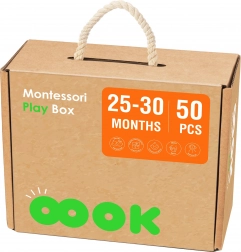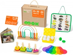 Vzdělávací box obsahuje několik aktivit, jako je třídění tvarů, zvířecí puzzle a barevné optické desky, které rozvíjejí zrakovou představivost a manuální zručnost. Další aktivity jsou například počítadlo s duhou, které učí malou matematiku, a Montessori kuličková dráha, která zdokonaluje koordinaci očí a rukou. K dispozici jsou také knihy, které pomáhají dětem pochopit vztahy mezi velkým a malým, stejně jako mnoho dalších kreativních cvičení.