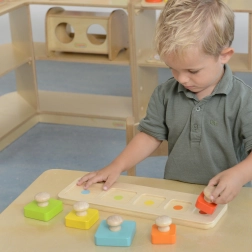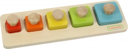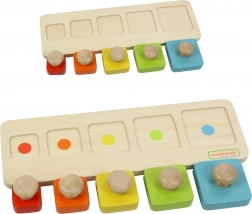 Dřevěná vzdělávací hračka inspirovaná metodikou Montessori je ideální pro rozvoj jemné motoriky, senzorických schopností a koordinace ruka-oko u dětí. Skládá se z pětice čtvercových bloků v různých barvách a velikostech, které dítě zasazuje do odpovídajících míst na dvojstranné základně: jedna strana obsahuje barevné puntíky pro snazší odpovídání, druhá strana pouze vyřezané otvory pro zvýšení obtížnosti.