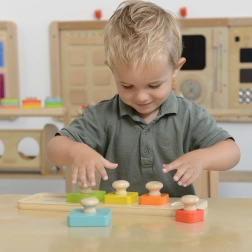 Dřevěné bloky a vyřezané otvory podporují precizní práci rukou a očí, kterou děti při zasazování dílků procvičují.