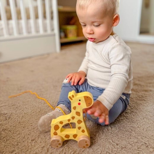 Žirafa je vyrobena z odpovědně získaného dřeva a natřena bezpečnými barvami. Hra s tahací hračkou přirozeně rozvíjí koordinační schopnosti, rovnováhu a soustředění, a motivuje děti k chůzi a aktivní hře.