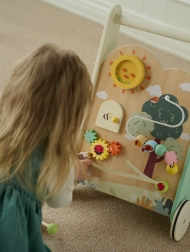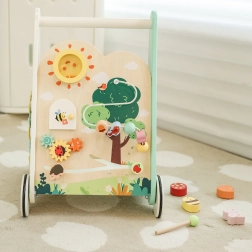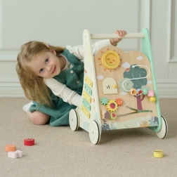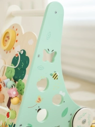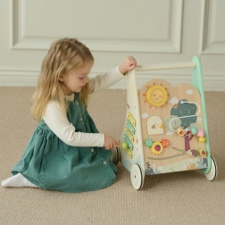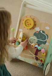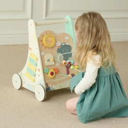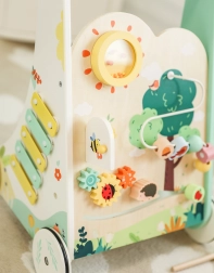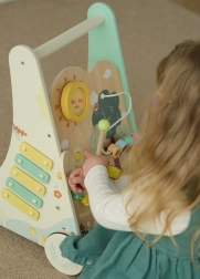 Chodítko roste spolu s dítětem: od podpory při chůzi až po samostatnou hru s aktivitami, které rozvíjejí jemnou motoriku, koordinační schopnosti, sluch a logické myšlení. Povrchy jsou ošetřeny zdravotně nezávadnými barvami v jemných, lákavých odstínech.