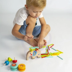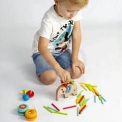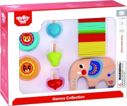 Tato pestrá 46dílná dřevěná sada kombinuje několik oblíbených her do jednoho balení. Děti mohou vyvažovat tyčinky na zádech slona, stavět věž či studnu, hrát mikádo, trénovat triky s dvojicí jojí a měřit, č whose káča se bude točit déle. Ideální pro samostatnou hru i rodinné soutěžení.