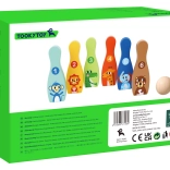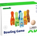 Dřevěná bowlingová sada se šesti barevnými kuželkami a míčkem je ideální hrou do dětského pokoje. Každá kuželka má zvířecí motiv a číslování 1–6, díky čemuž děti při hře přirozeně trénují počítání, poznávání barev a rozvíjejí motorické dovednosti.
