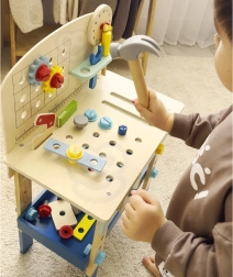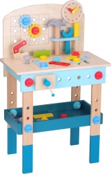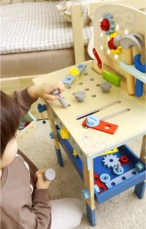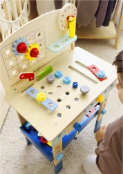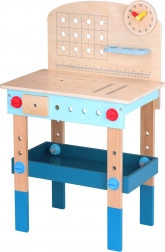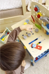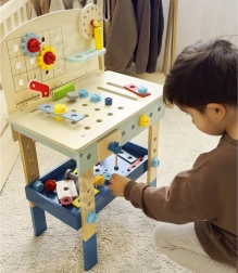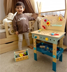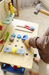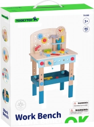 Dětský dřevěný pracovní ponk od značky TOOKY TOY je skvělé kreativní dětské nářadí pro malé kutily od 3 let. Obsahuje bohatou sadu nástrojů (pilka, kladívko, klíč, šroubovák, svěrák, měřítko) a barevné šroubky, matice, podložky a ozubená kola. Stabilní provedení, bezpečně zaoblené hrany a netoxické barvy zajistí pohodové a bezpečné hraní i učení se základům práce s nástroji.
