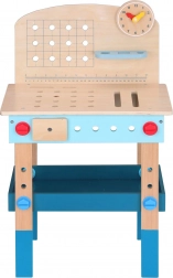 Přehledné police, háčky a pracovní deska umožní dětem snadno ukládat a používat pilku, kladívko, klíč, šroubovák i měřítko. Ideální pro samostatnou hru a učení.