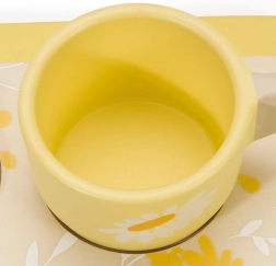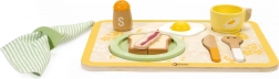 Set obsahuje talíř, příbor, hrnek, sůl, pepř, vajíčko, topinky, plátek slaniny a další.