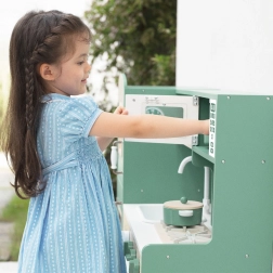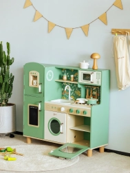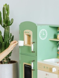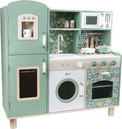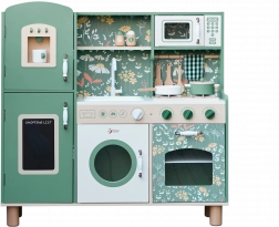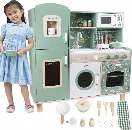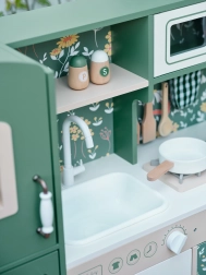 Seznamte se s touto unikátní dětskou kuchyňkou, která přináší nekonečné možnosti pro hraní rolí. Kuchyňka je vyrobena převážně ze dřeva a nabízí krásné květinové vzory na zeleném pozadí, které dodávají celému setu kouzelný retro vzhled.
