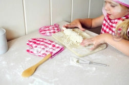 Růžovo-bílé kárované rukavice a podložka chrání malé ručičky před horkými povrchy, což dělá vaření bezpečným.