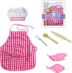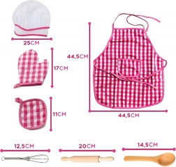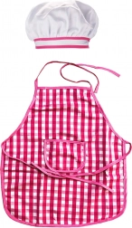 Zástěra a čepice s růžovo-bílým károvaným vzorem jsou hlavními prvky, které zajišťují stylový a funkční herní zážitek pro děti.