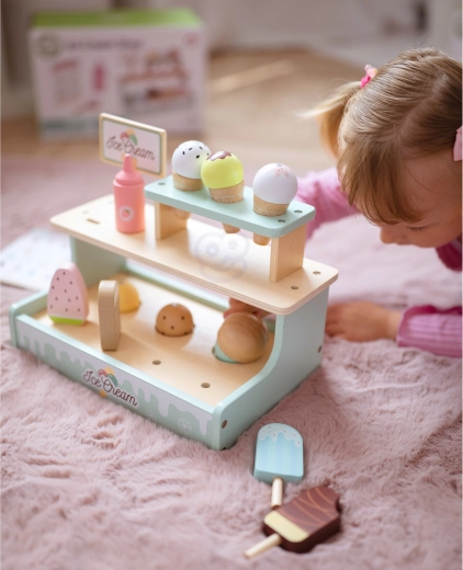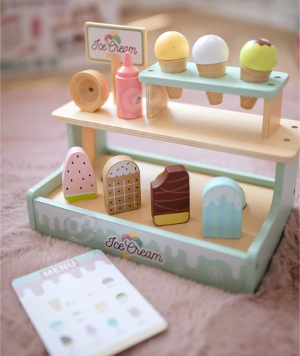 Staňte se zmrzlinářem s půvabným dřevěným stánkem WOOPIE GREEN. Pastelový set z bezpečného dřeva nabízí kornouty, kopečky i nanuky, magnetické spojování kopečků a menu pro hraní na obchod. Podporuje jemnou motoriku, představivost a role‑play.