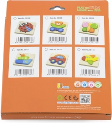 Každý puzzle má jiný tvar - letadlo, beruška, auto a motýl, což podporuje koordinaci a poznávací schopnosti.