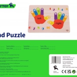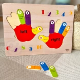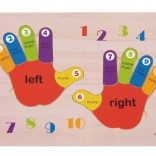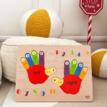 Tato kvalitní dřevěná skládačka pomáhá dětem osvojit si základy matematiky i orientaci v prostoru. Dvě barevné dlaně s vyjímatelnými prsty jsou přehledně označené – pravá/levá, čísla prstů a názvy prstů. Děti si tak snadno propojí vizuální vjem s počítáním i jazykem a mohou si vše hned vyzkoušet na vlastních rukou.