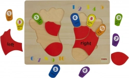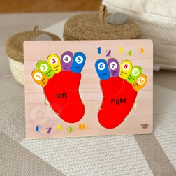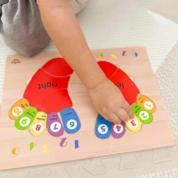 Dřevěná puzzle od značky TOOKY TOY je ideální pomůcka pro děti při jejich prvních krocích do světa matematiky. Tabule a všechny její prvky jsou vyrobeny z vysoce kvalitního dřeva a jsou dokonale přizpůsobeny velikosti dětských nohou. Barevné stopy jsou označeny stranami: levou a pravou, a každý prst má přiřazené číslo, což pomáhá dětem přenést naučené znalosti na počítání na vlastních prstech.