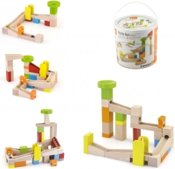 Postavte si vlastní dobrodružnou kuličkodráhu z 49 pevných dřevěných dílků a sledujte, jak skleněné kuličky sviští po tratích a rampách. Set nabízí kreativní stavění, učení principů příčiny a následku a rozvoj motoriky. Praktický kbelík s uchem zajistí snadné ukládání a přenášení. Barevné, hladké dílky z bezpečného lakovaného dřeva a hravé prvky (schůdky, medvídci) potěší každé dítě.