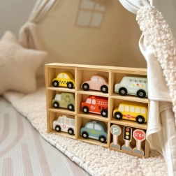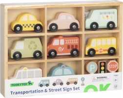 Dřevěný set vozidel a dopravních značek od značky Tooky Toy je ideální pomůcka pro děti na učení pravidel silničního provozu. Obsahuje barevná vozidla a značky, které dětem zpříjemní hru a zároveň je naučí rozpoznávat dopravní symboly.