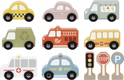- Set obsahuje 8 různých vozidel: taxi, osobní vůz, food truck, popelářské auto, hasiči, školní autobus, sanitka, policejní vůz