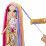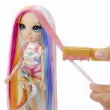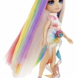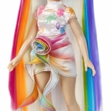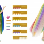 Panenka má mimořádně dlouhé, hladké vlasy s duhovými pramínky, které se snadno češou, zaplétají a tvarují do různých stylů – od vln přes copánky až po výrazné barevné linie.