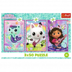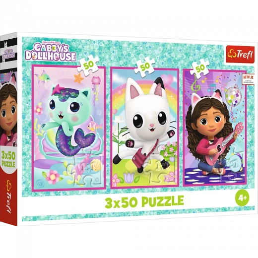 Puzzle 3x50 - Seznamte se s Gabby a jejími kočičkami je zábavná sbírka inspirovaná pořadem Gabbys Dollhouse. Skládání je nejen zábava, ale i způsob, jak rozvíjet jemnou motoriku a představivost.