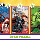 Objevte zábavu pro celou rodinu s třemi sadami po 50 dílcích v jednom balení. 3 puzzle v jednom znamená více radosti, sdíleného skládání a rozvoje dovedností. Motivy s hrdiny DISNEY MARVEL THE AVENGERS – Captain America, Thor a Hulk – potěší každého malého fanouška superhrdinů.