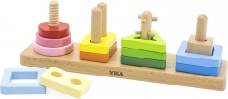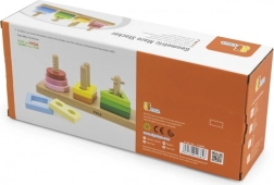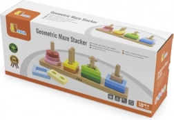 Dřevěný geometrický labyrintový sorter VIGA je ideální vzdělávací hračka pro děti od raného věku. Barevné dílky se skládají na čtyři různě tvarované kolíky, které vyžadují správné nasměrování a prostrčení výřezy. Tím dítě přirozeně trénuje trpělivost, logiku a jemnou motoriku.