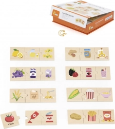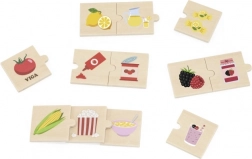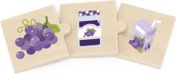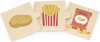Tento kvalitní dřevěný set představuje jednoduché skládačky, které propojují surovinu s jejím zpracovaným produktem. Děti se zábavnou formou učí, odkud pocházejí jejich oblíbené pochoutky – například brambora a hranolky, citron a limonáda, kukuřice a popcorn nebo hrozny a hroznový džem/šťáva.