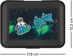 Přinášíme vám unikátní plastový lunchbox s moderním a výrazným designem. Tento černý box s graffiti stylem je ideální pro každodenní použití do školy nebo do práce. Jeho graficky zajímavé víčko osloví především milovníky skateboardingu a aktivního životního stylu.