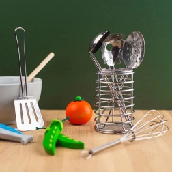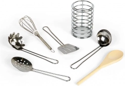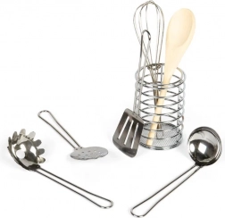 Sada nástrojů je uložena v praktické válcové nádobě, což usnadňuje manipulaci a uskladnění. Děti mohou šlehat, míchat a servírovat jako praví kuchaři, což rozvíjí jejich jemnou motoriku a koordinaci ruka-oko. Vyrobeno z kvalitních materiálů, náčiní je také bezpečné a netoxicky nabarvené.