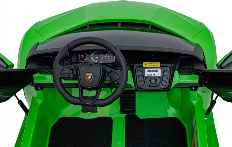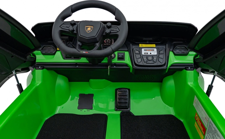 Interiér potěší dvojitým sedadlem z ekokůže s pásy a bohatou multimediální výbavou: FM rádio, Bluetooth, USB, AUX a přehrávání MP3 + předinstalované melodie. LED světla vpředu i vzadu, sportovní detaily a scissor doors podtrhují autentický vzhled LAMBORGHINI. Rodiče ocení dálkové ovládání 2,4 GHz se 3 rychlostmi a bezpečnostním tlačítkem Stop.