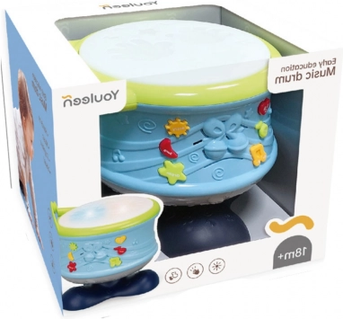Díky praktickému madlu je bubínek snadno přenosný – ideální domů i na cesty. Tlačítka spouštějící různé melodie podporují sluchové vnímání a rozvoj rytmiky, zatímco manipulace s hračkou zlepšuje jemnou motoriku a koordinaci.