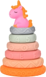 Tato stavebnice se skládá ze sedmi prvků, včetně rozkošného jednorožce a šesti měkkých kroužků, které lze libovolně skládat a přizpůsobovat. Každý kroužek má unikátní vzory a textury, včetně čísel a písmen, což podporuje rozvoj hmatu a rané učení formou hry.