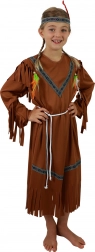 Dívčí kostým je navržen pro pohodlí i efekt: hnědé šaty zdobí kontrastní lemy a bohaté třásně, které se krásně vlní při každém kroku. Příjemný textilní materiál a volnější střih podporují volnost pohybu, takže si vaše dítě užije zábavu bez omezení. Sladěná čelenka s peřím dotváří celkový vzhled a šňůrka poslouží jako jednoduchý opasek.