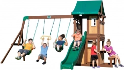 Kompaktní venkovní hřiště BACKYARD DISCOVERY Lakewood přináší dětem nekonečnou zábavu i na menší zahrady. Nabízí dvě houpačky, trapez pro malé akrobaty, vyvýšenou herní platformu s barevným stínidlem, skutečné dveře a okno s lavičkou a hlavně rychlou skluzavku 244 cm. Odolná cedrová konstrukce a promyšlené detaily zajišťují bezpečnou hru pro děti od 3 let.