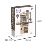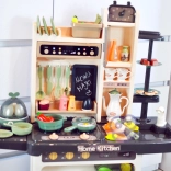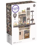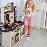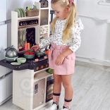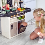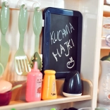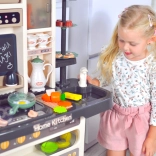 Součástí je také vajíčkovar s LED světlem a zvukem, otvírací trouba a lednice, tabule na křídu pro denní menu, sušák na nádobí a řada úložných prvků. Bohatá sada 65 doplňků zahrnuje ovoce a zeleninu na suchý zip, nádobí, příbory i čajovou sadu, takže děti mají vše, co potřebují pro tvořivou hru.