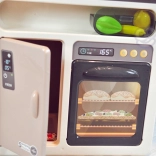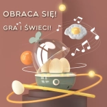 Otočte knoflíkem a sledujte, jak se rozsvítí hořák, ozvou se zvuky vaření a vyjde studená pára, která bezpečně napodobí skutečné vaření.
