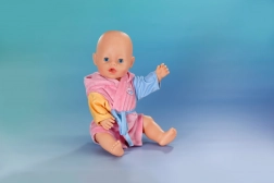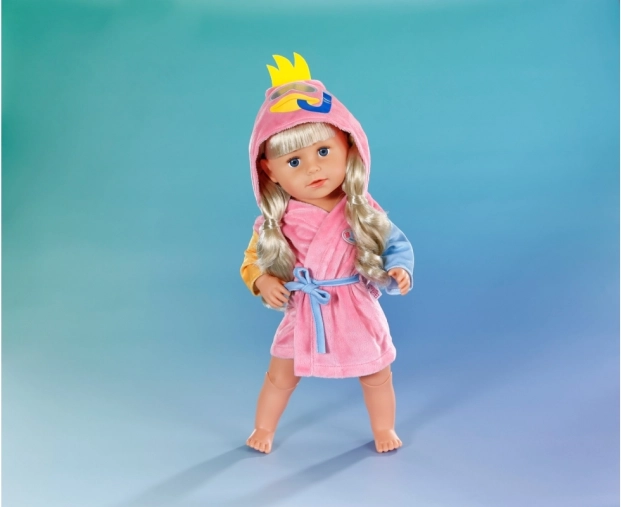 Hebký materiál a zavazování v pase udrží panenku v teple a pohodlí – ideální pro koupací rituály a každodenní hraní.