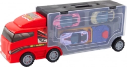 Tento červený kamion s garáží a vystřelovačem je skvělou volbou pro děti, které milují auta, závody a sbírání modelů. Průhledná návěsová část umožňuje snadno vidět uložené autíčka a přihrádky podporují pořádek i samostatnost při hraní.