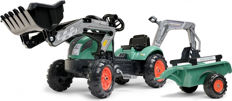 Šlapací traktor FALK s předním nakladačem a přívěsem je skvělá volba pro malé farmáře ve věku 2–5 let. Nabízí robustní zpracování, funkční pohyblivou lopatu, klakson na volantu a bezpečnou stabilní konstrukci. Vyrobeno z kvalitního plastu, z toho z části z recyklovaných materiálů – ideální dárek pro aktivní venkovní hru.